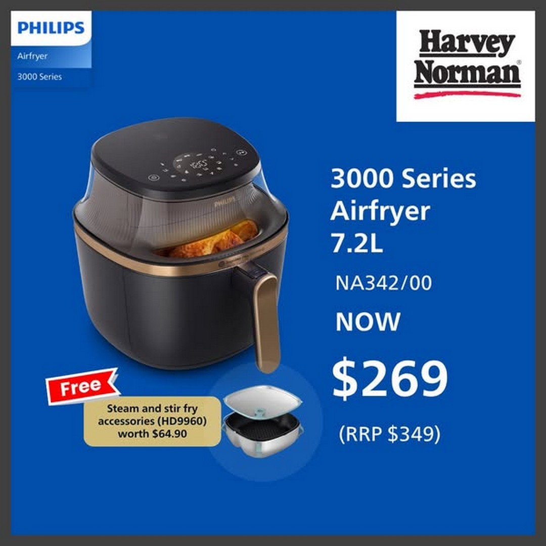 In conclusion, the Philips 3000 Series Airfryer promotion at Harvey Norman Singapore isn’t just a sale; it’s an invitation to enhance the everyday cooking experience. With its versatile functions, energy-efficient technology, and the added bonus of free accessories, it’s perfect for anyone looking to save time, explore new recipes, or simply make healthier versions of favourite meals. At $269 with accessories worth $64.90, the deal represents excellent value that savvy shoppers shouldn’t overlook.