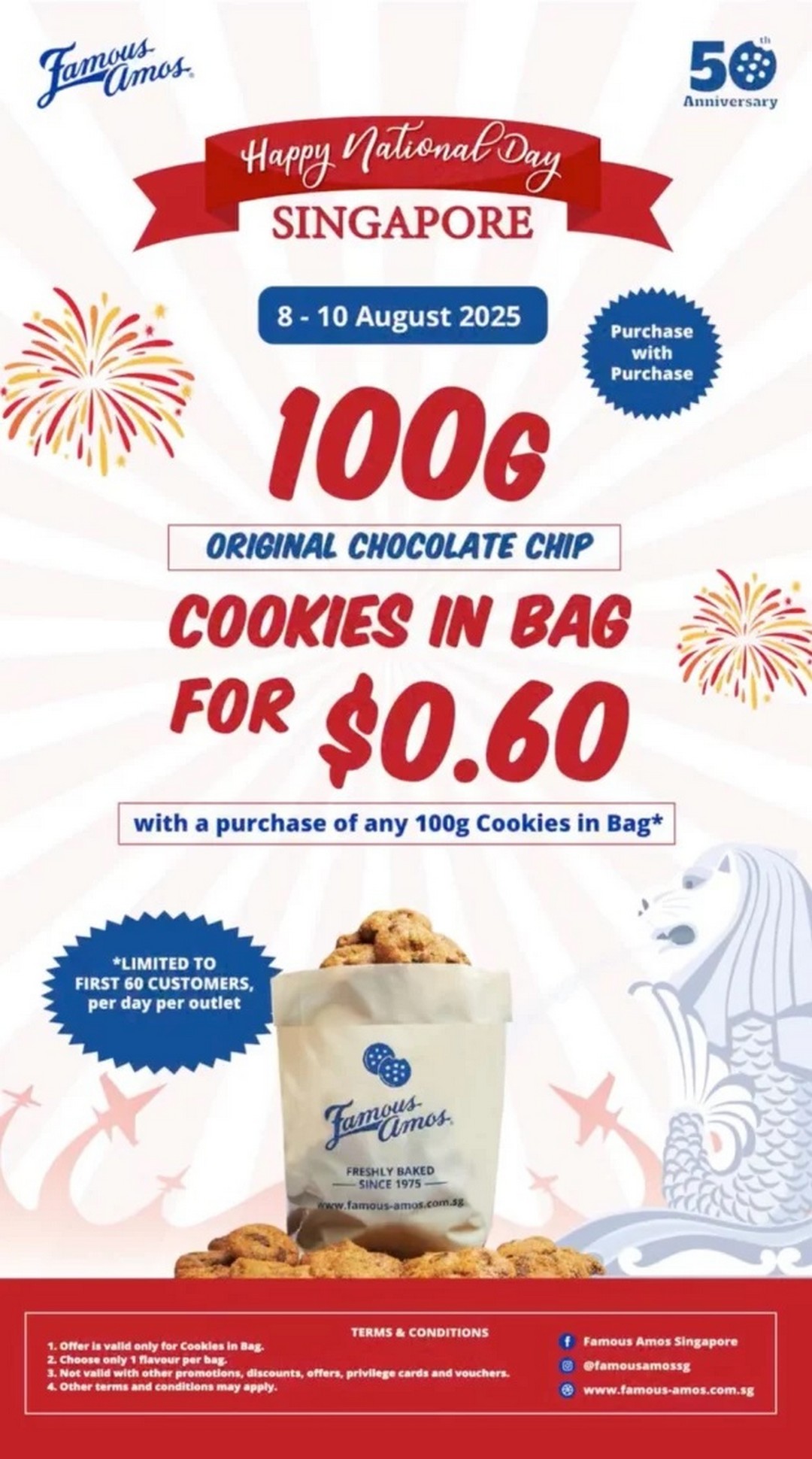 If you’re a cookie lover in Singapore, here’s a deal that will surely brighten your National Day celebrations this year. Famous Amos, a well-loved name for its classic, buttery, chocolate chip cookies, is offering an irresistible promotion that simply cannot be missed. For a limited time, cookie fans can get a 100g bag of their Original Chocolate Chip cookies for just $0.60. The catch? You need to purchase another 100g bag of cookies in any flavour at the usual price to qualify for this fantastic discount.