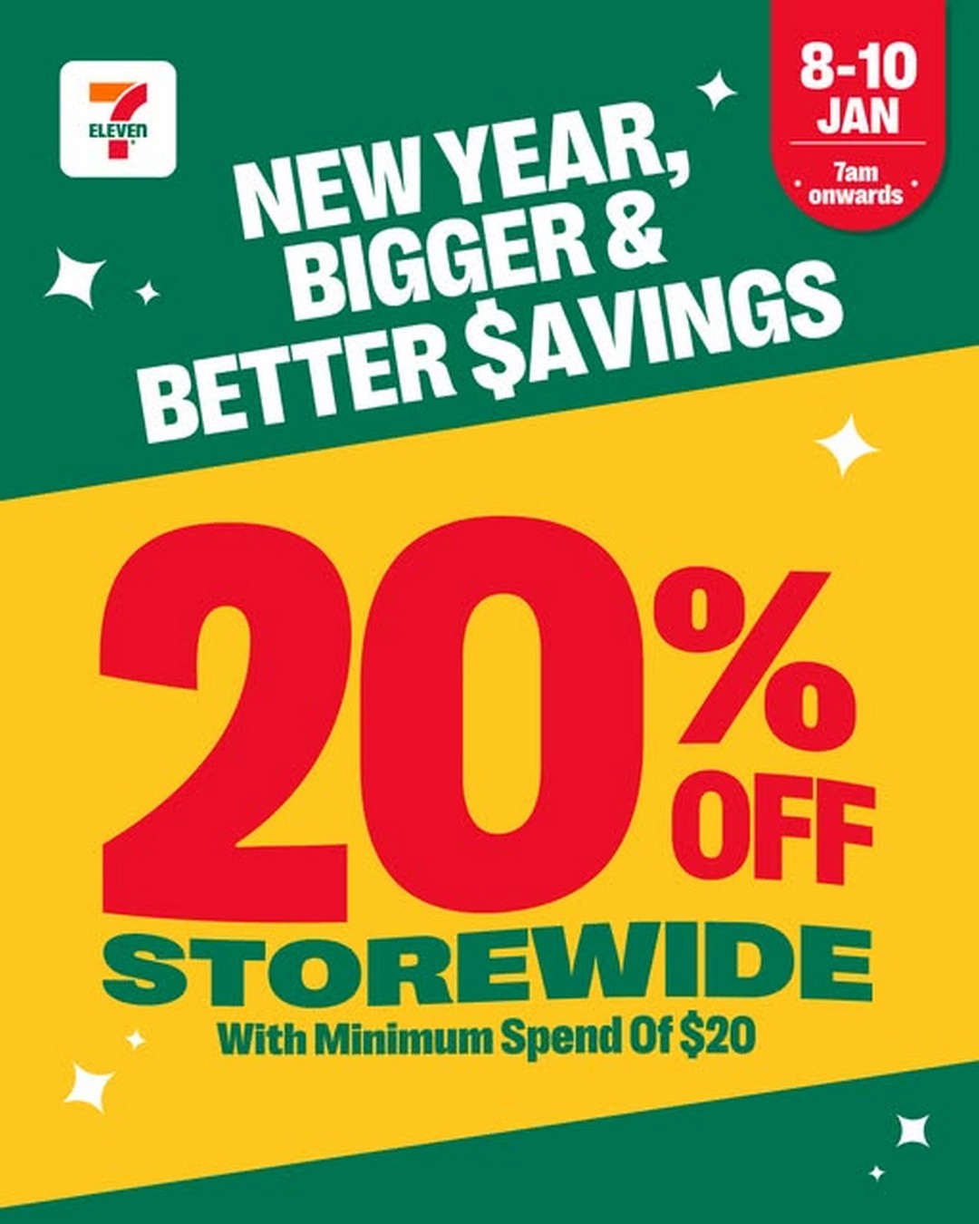 From 8 to 10 January 2026, 7-Eleven Singapore is offering 20% off storewide for customers who spend a minimum of $20 in a single receipt. This promotion runs from 7am onwards on 8 January and is available across most neighbourhood outlets islandwide. For shoppers who already rely on 7-Eleven for snacks, drinks, ready-to-eat meals, groceries, and daily essentials, this promotion presents a timely chance to save while stocking up.
