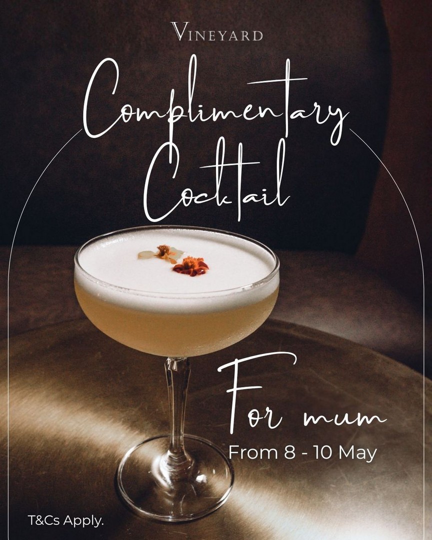 This year, one such offering can be found at Vineyard, tucked away in the serene surroundings of HortPark. From 8 to 10 May 2026, they are rolling out a simple but meaningful gesture: mums will receive a complimentary cocktail with any main course ordered.