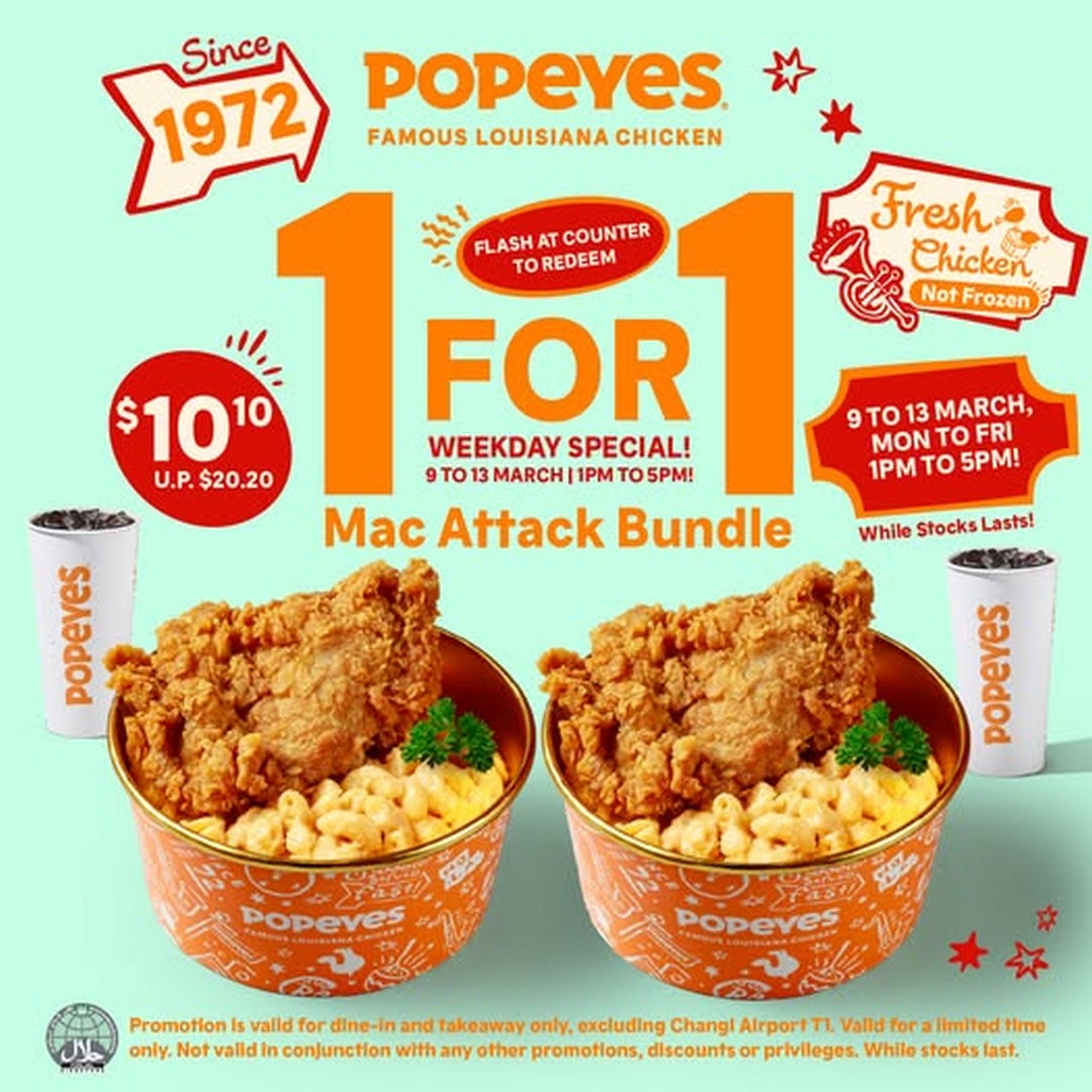 For all mac and cheese enthusiasts in Singapore, Popeyes has rolled out a treat that’s hard to resist. Their latest promotion, the 1 FOR 1 Mac Attack Bundle, is a perfect way for them to indulge in a creamy, cheesy delight without burning a hole in their wallet. This deal is designed for anyone who loves the comforting combination of golden, cheesy macaroni paired with Popeyes’ signature crispy chicken.