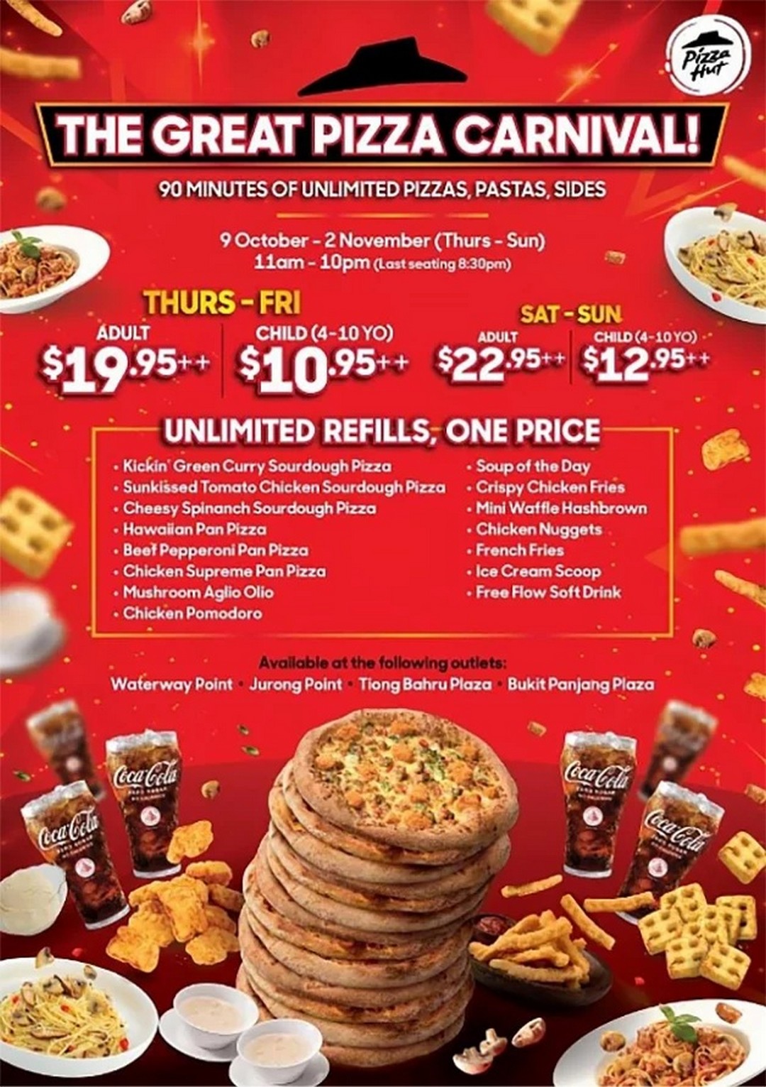 The Great Pizza Carnival buffet will be available exclusively at four selected Pizza Hut outlets across Singapore: