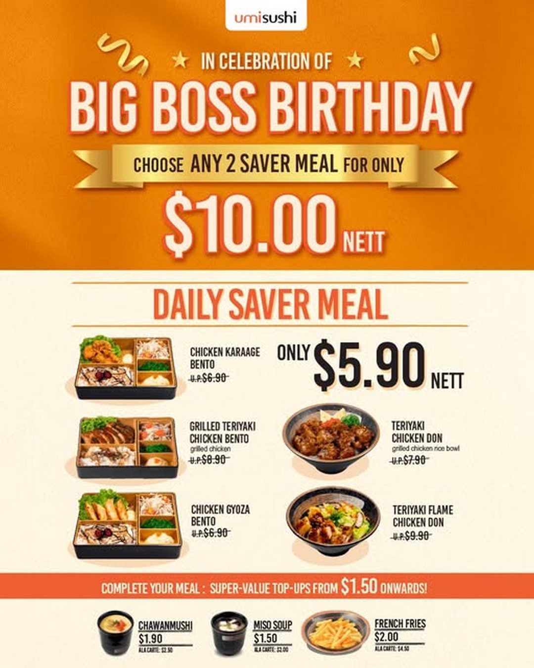 Umisushi Singapore is turning up the celebration this October with a delightful treat for sushi lovers everywhere. In honour of their Big Boss Birthday Bash, them have come up with a promotion that is bound to make fans of Japanese cuisine smile. For a limited time, anyone visiting an Umisushi outlet can enjoy any two Saver Meals for just $10 nett. This is an incredible chance to double up on your favourite sushi sets without stretching your wallet.
