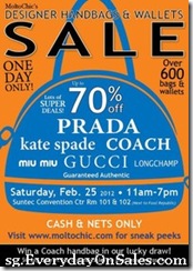 Summary: MoltoChic will be having a 2 day Designer Handbag Warehouse Sale on 13 July to 14 July 2012. Over 700 brand new bags and wallets on sale from brands like Prada, Gucci, Kate Spade, Coach, Marc by Marc Jacobs, Furla, Miu Miu and many more. Mark it down, don’t miss it!