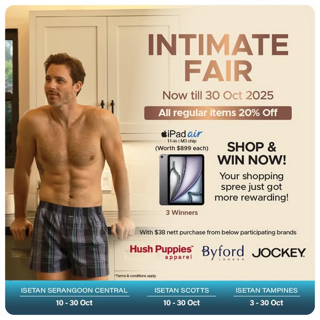 Whether you’re looking for yourself or shopping for someone else, there’s plenty to enjoy at the Men’s Intimate Fair. From practical purchases to potentially winning an iPad, it’s a promotion that merges everyday needs with a touch of indulgence. Don’t miss out on this opportunity – visit Isetan Singapore’s participating locations and make the most of these exclusive offers before 30 October 2025.
