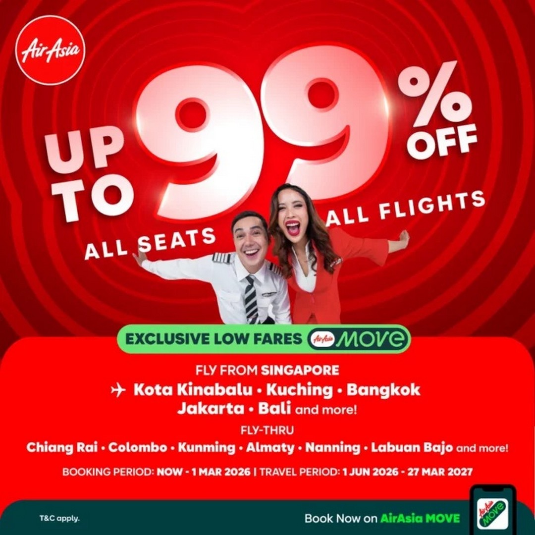 AirAsia has just rolled out one of its boldest campaigns of the year, offering up to 99% off all seats across its network. Yes, all seats and all flights under the promotion banner. For travellers departing from Singapore, this could easily be one of the most compelling airfare sales to secure trips not only for the second half of 2026, but right through to early 2027.