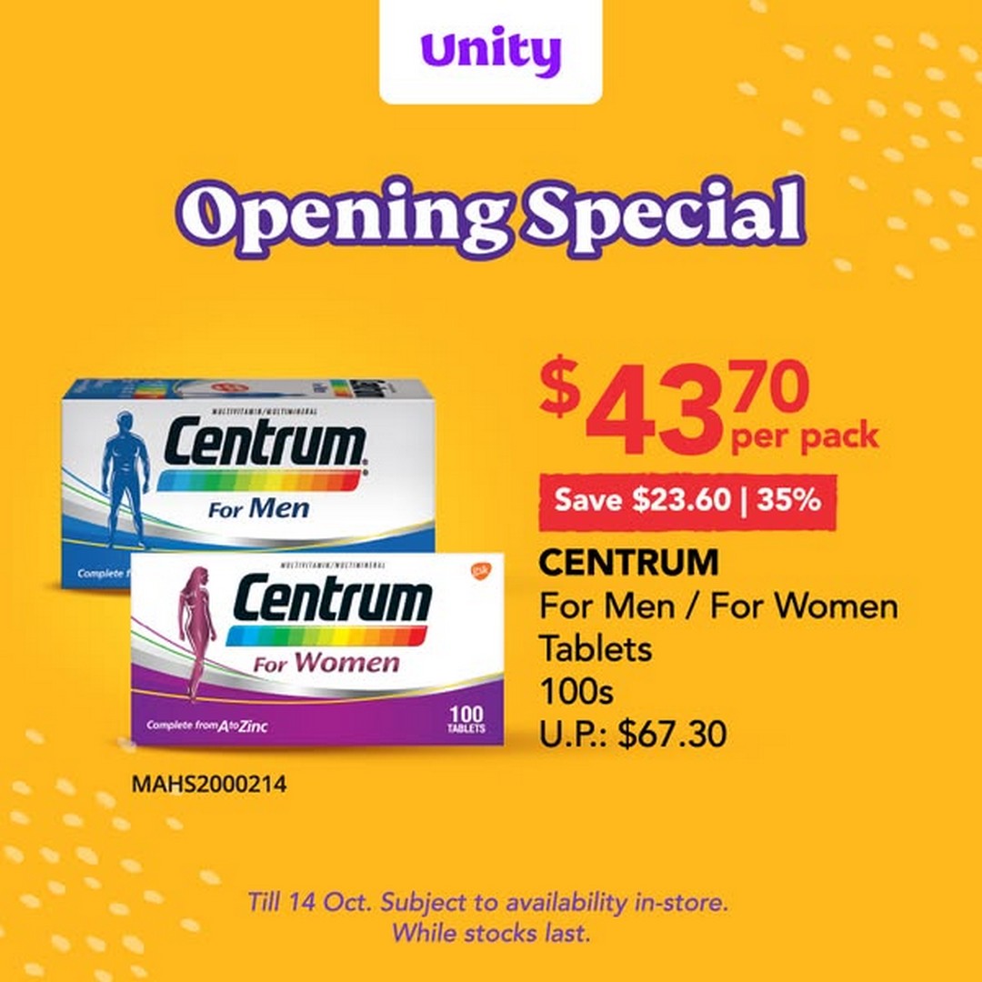 Venue: Unity Pharmacy, 10 Paya Lebar Rd, B2-14, PLQ Mall, Singapore 409057