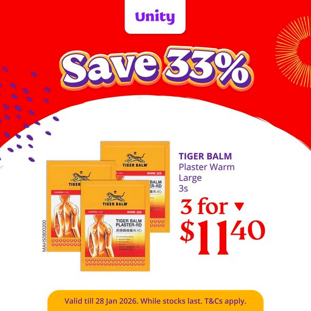 Unity Pharmacy has also included everyday relief products that many households keep on standby. The TIGER BALM Plaster Warm Large 3s offer, priced at 3 packs for $11.40, is a good example. Whether it is muscle aches from spring cleaning or general discomfort after long hours of standing or walking, these plasters are a familiar and trusted solution. Buying them in a bundle allows people to keep extras at home without paying full price later.