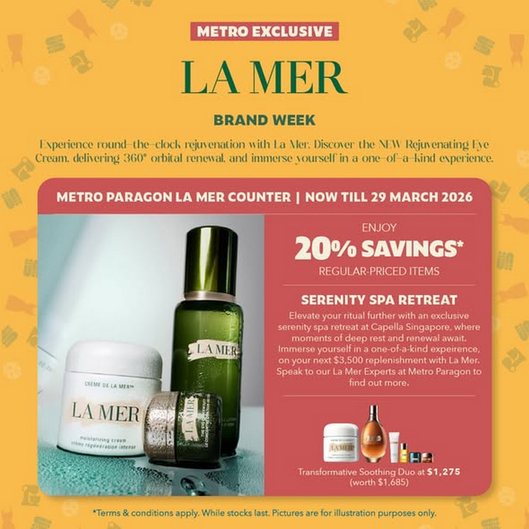 One of the main highlights is the La Mer Brand Week, featuring the globally recognised luxury skincare brand La Mer. Known for its premium formulations and focus on skin renewal, La Mer rarely comes with significant discounts. That is what makes this offer particularly attractive. Shoppers can enjoy 20% savings, which already represents a substantial reduction considering the usual price points. More importantly, those who spend a minimum of $3,500 unlock an exclusive Serenity Spa Retreat experience at Capella Singapore.