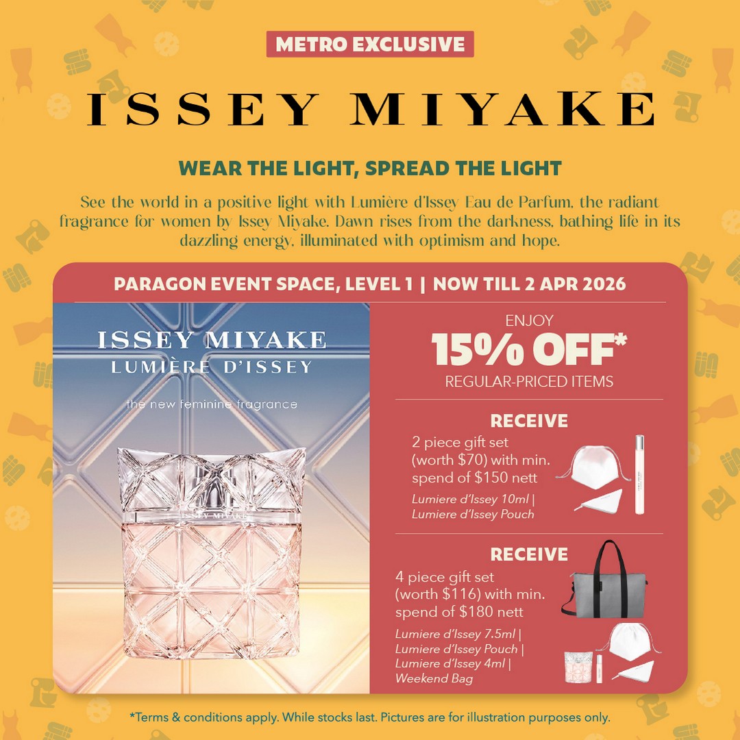 For those who lean towards fragrances, Issey Miyake presents the Lumière d’Issey collection. This fragrance line is described as uplifting and optimistic, ideal for those who want something light yet memorable. With 15% off and additional gifts available for minimum spending tiers of $150 or $180, it offers a good opportunity to explore a new scent or gift someone something thoughtful.