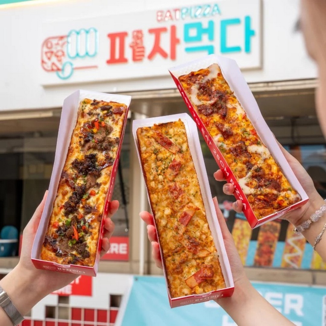 The pizzas themselves are based on a 25cm rectangular Korean-style format, which differs from traditional round pizzas. This shape is designed for portability and even slicing, making it easier for individuals to eat on the go without needing cutlery or a full dining setup.