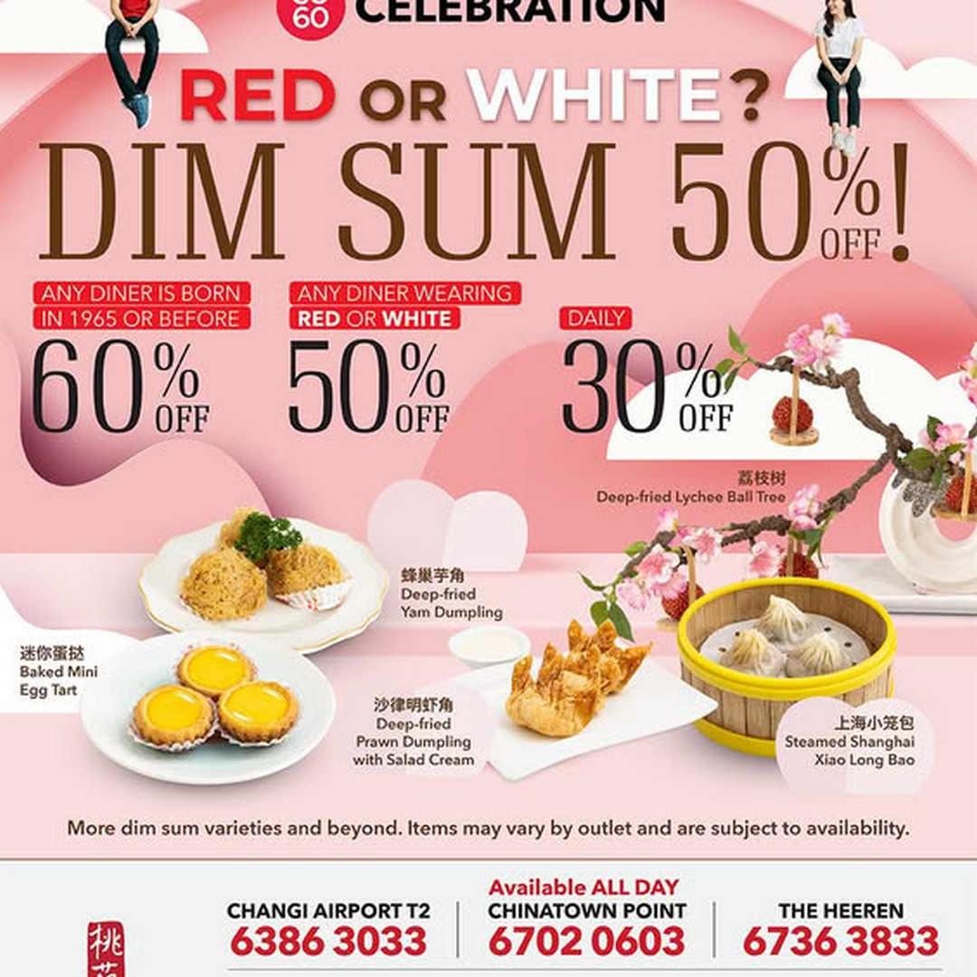 The promotion is simple yet incredibly rewarding. Peach Garden is offering up to 60% off for diners born before 1965. That’s right—anyone who has a birthday before that year is eligible to enjoy an impressive discount on their meal. For the younger diners, there’s still a generous offer: those wearing red or white get 50% off their dim sum experience. This clever way of blending festive spirit with rewarding discounts ensures that everyone can participate and enjoy the atmosphere of a grand dining celebration.