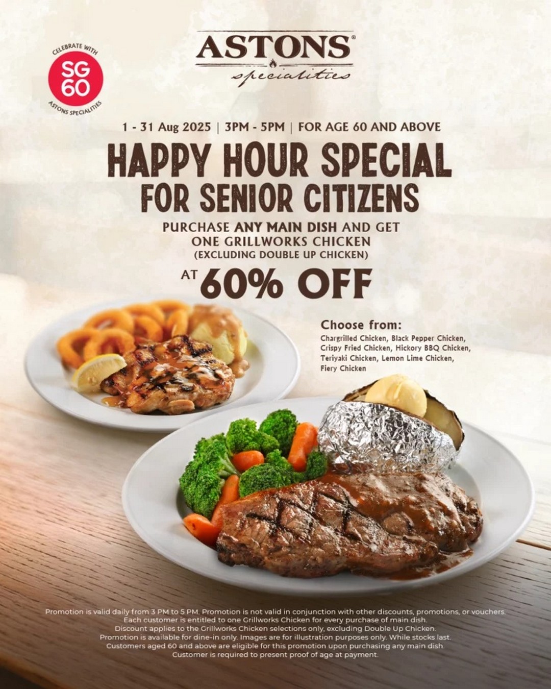 Between 3 PM and 5 PM daily, seniors aged 60 and above who order any main dish at ASTONS will get a whopping 60% discount on one Grillworks Chicken item. It’s that simple — no complicated vouchers, no tricky minimum spend, just good old-fashioned value.