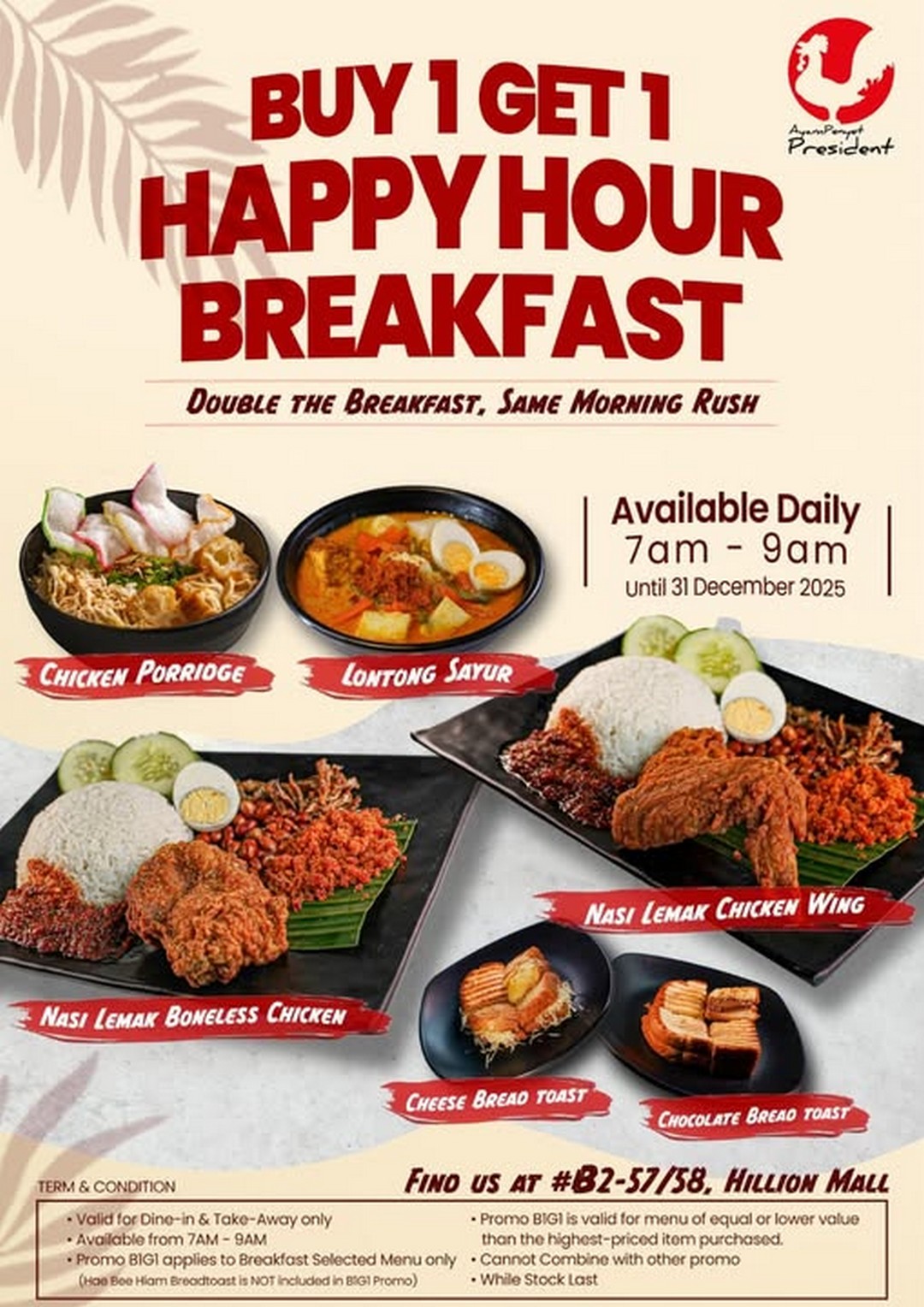 Ultimately, this Ayam President Buy 1, Get 1 FREE Happy Hour Breakfast promotion is about making mornings easier, better, and more affordable. It removes the common excuses for skipping breakfast and replaces them with a practical, value-driven option. For anyone who believes that a good day starts with a good meal, this is a promotion worth enjoying while it lasts.