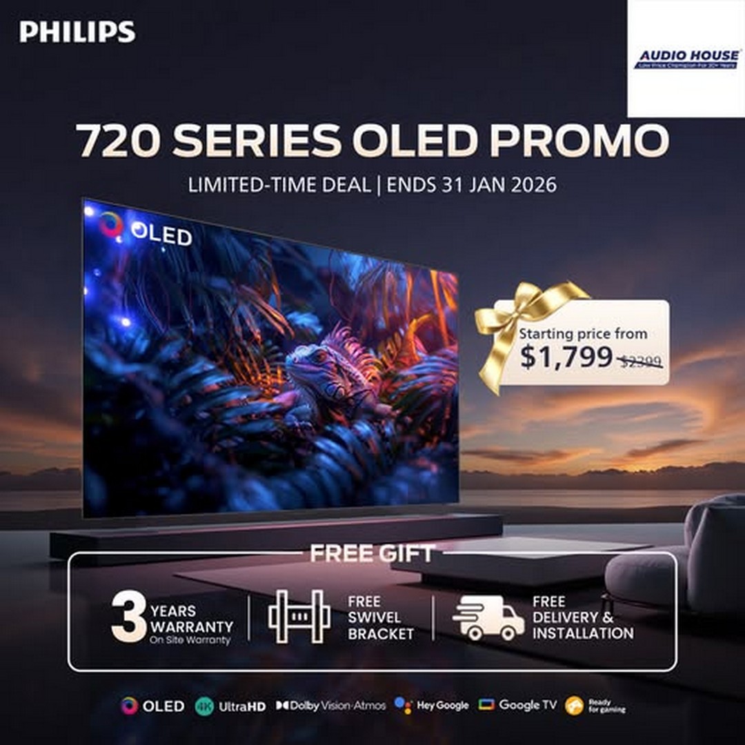 Now till 31 January 2026, Audio House Singapore is offering the Philips OLED 720 at a promotional price starting from $1,799, reduced from the usual $2,399. That is a clear saving of $600 on a television that sits firmly in the premium OLED category. On top of that, the promotion includes free installation and delivery, which removes additional costs that are often overlooked when purchasing a large-screen TV. For many households, those extra charges can easily add a few hundred dollars to the final bill, so having them included makes the deal even more appealing.